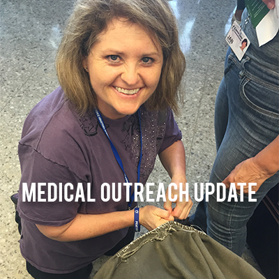We take dozens of bags of medical supplies with us as we travel. Here’s a look at how Tiffany, one of our International Event Coordinators, shared her room for the night.