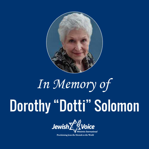 It is with sadness that we report the passing of Dorothy (Dotti) Solomon, a beloved member of the Jewish Voice Ministries International Board of Directors.